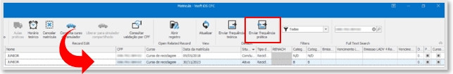 O envio de frequência é um procedimento realizado pelo sistema Admin e é uma ação que só é permitida quando não constarem aulas no simulador, mas estarem com status de realizadas no painel Detran.