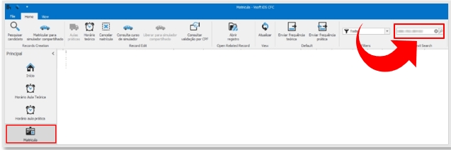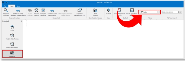 1º Passo: Acesse o sistema Admin e, ao logar clique na função Matrícula, em seguida no campo Filter selecione a opção Todas.