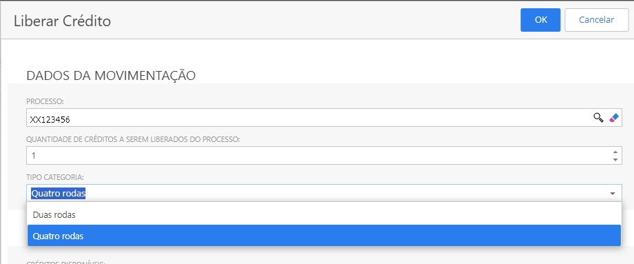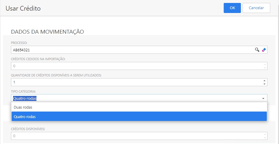 - Categoria que irá receber os créditos, se 2(duas) ou 4(quatro) rodas;