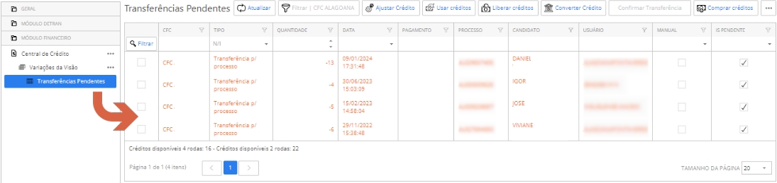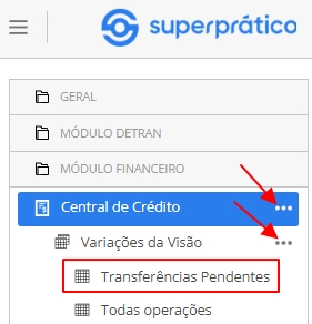 No menu lateral esquerdo, clique em “Módulo Financeiro” e em seguida em “Central de Crédito” e “Transferências Pendentes”