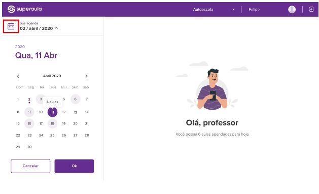 Você pode visualizar também as aulas agendadas para outros dias clicando no ícone de calendário (destacado em vermelho na imagem abaixo) e navegando pelas datas que deseja consultar.
