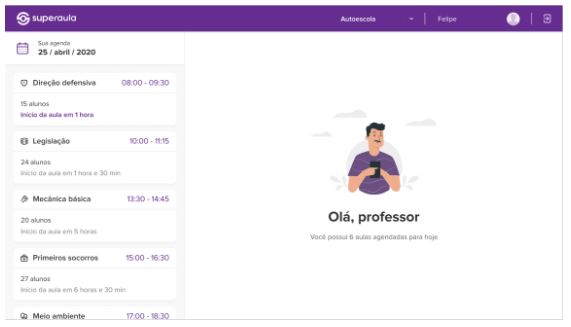 Ao acessar o SuperAula, as aulas agendadas podem ser visualizadas através da barra na lateral esquerda, onde estarão listadas as aulas e seus detalhamentos.