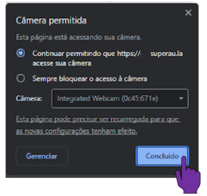 - Se estiver visível no momento que for realizar a primeira captura facial, clique no ícone da câmera na barra de endereço do seu navegador. Feito isto, selecione a primeira opção para permitir que o SuperAula acesse sua câmera e depois aperte em "Concluído".