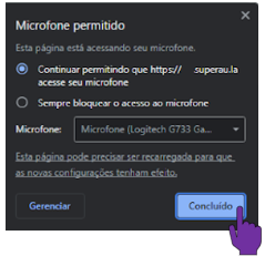 - Se estiver visível, clique no ícone do microfone na barra de endereço do seu navegador, selecione a primeira opção para permitir que o SuperAula acesse seu microfone e depois aperte em "Concluído".