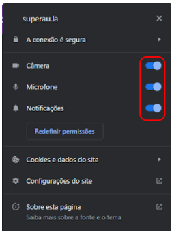 Ao clicar nele, selecione as opções para sempre permitir o uso da câmera e microfone, além de receber notificações da página do SuperAula. Em seguida, clique para concluir;