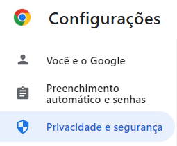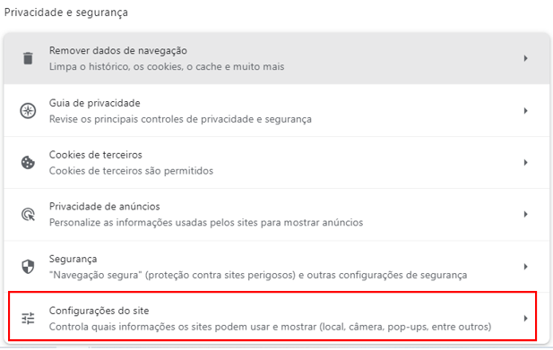 - Já na tela de configurações, selecione "Privacidade e segurança" e, dentre as opções mostradas, procure e clique em "Configurações do site";