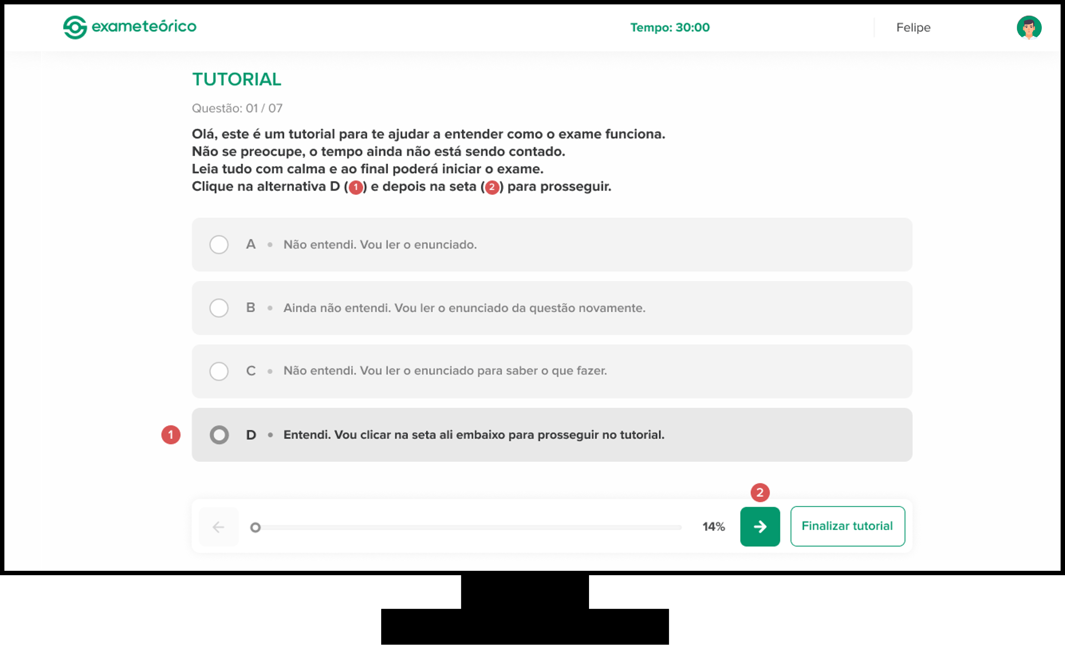 Após ingressar no sistema, o candidato irá acessar o tutorial ele mostra visão real de como é a estrutura da prova. O candidato deve ler o enunciado, marcar a alternativa que acredita ser a correta e apertar na seta verde para seguir para as questões.