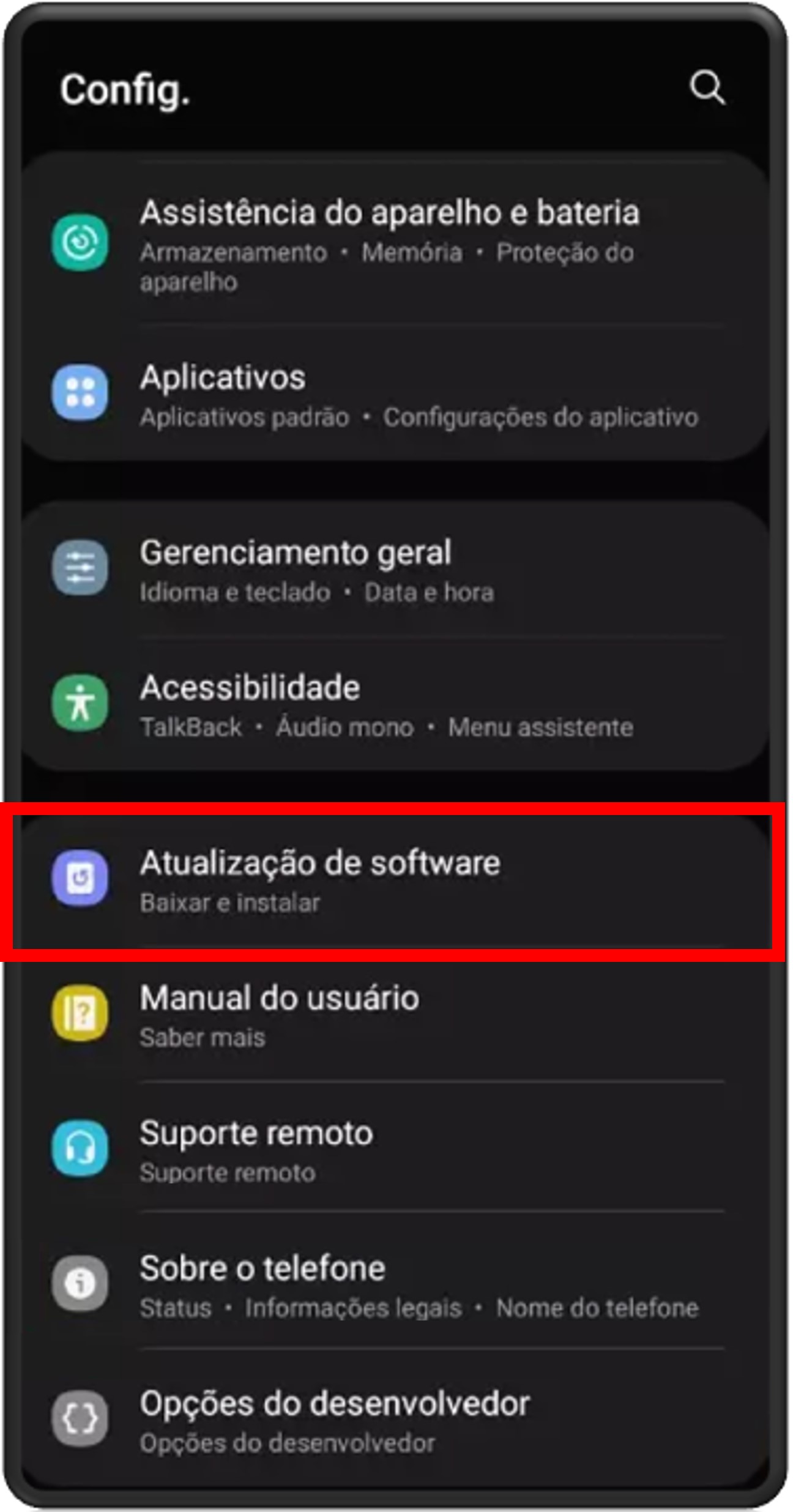 Na tela de configurações do aparelho, selecione a opção "Atualização de software" e, em seguida, "Baixar e instalar".