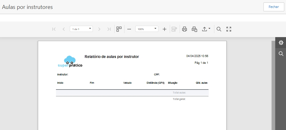 4º passo: o sistema irá exibir todo o relatório de aulas desse instrutor selecionado, contendo as informações de:
